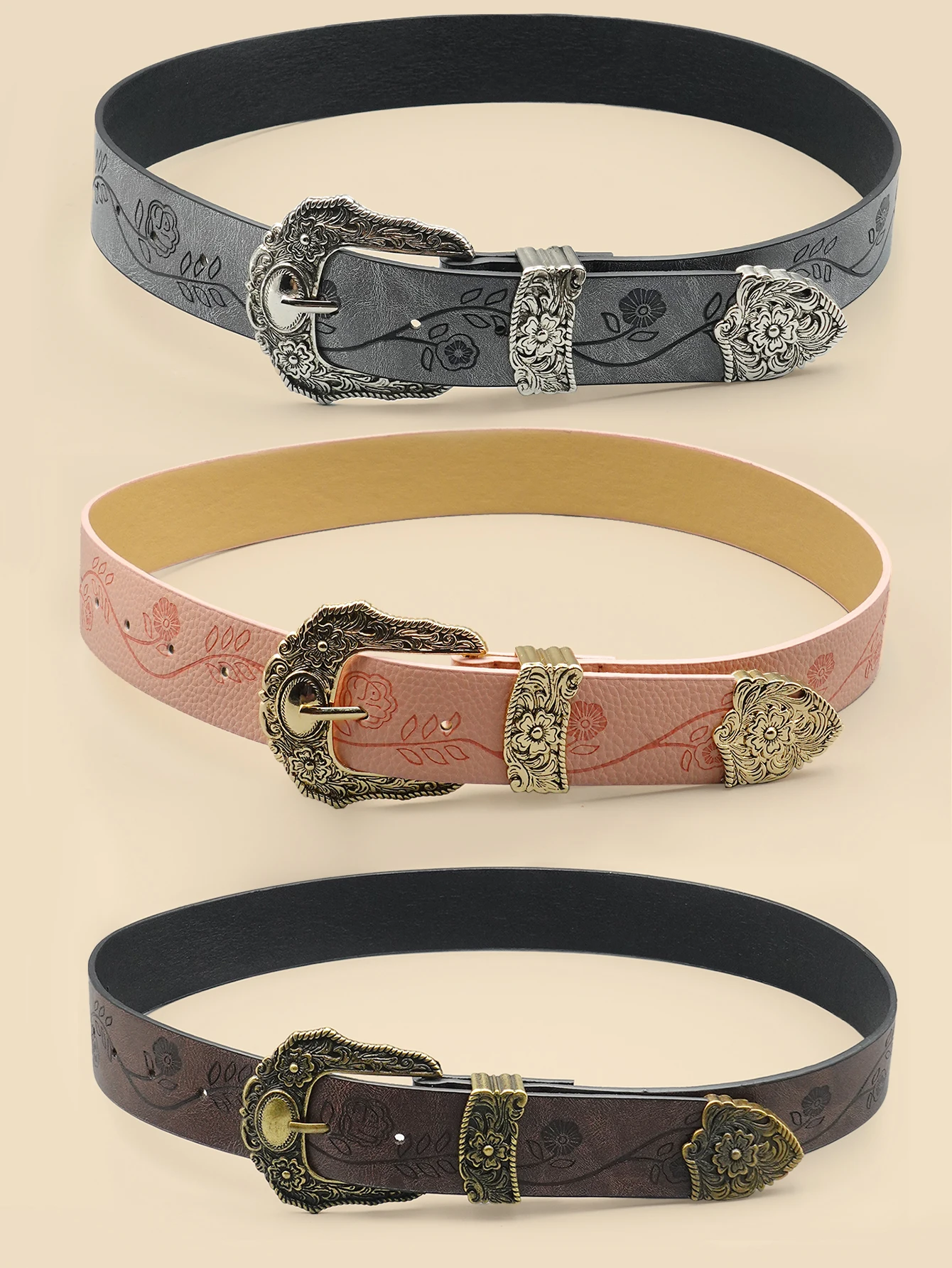 Men & Women-Western-Cowboy-PU Leather-Belts - Vintage Belt Floral Engraved Buckle Belt for Jeans