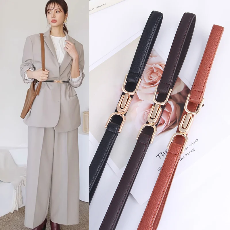 Simple Fashion Womens Leather Skinny Belt for Dress Adjustable Thin Waist Belt Dress Belt with Vintage Golden Buckle Faux Leathe