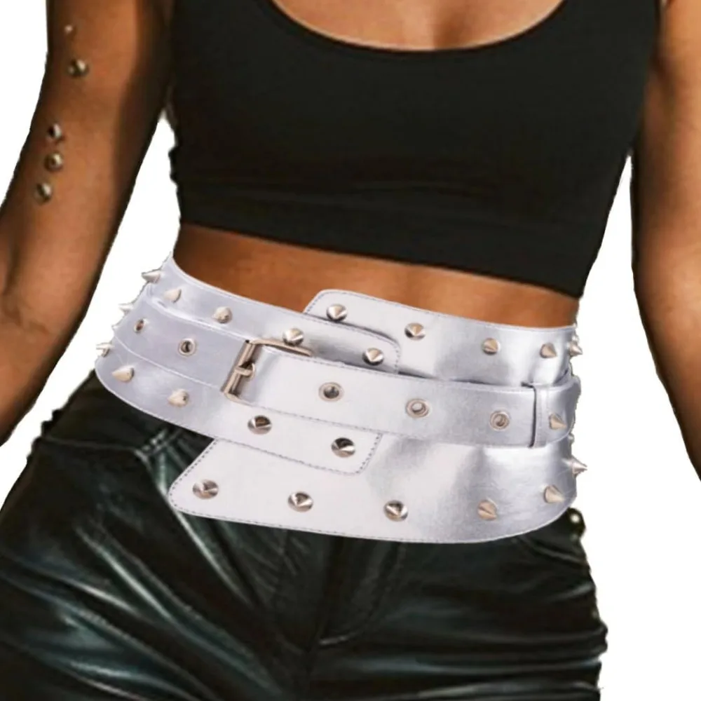 Silver Wide Belts Gothic Dress Belts Punk Studded Silver Belts Rivets Fashion Cinch Belt for Women Black