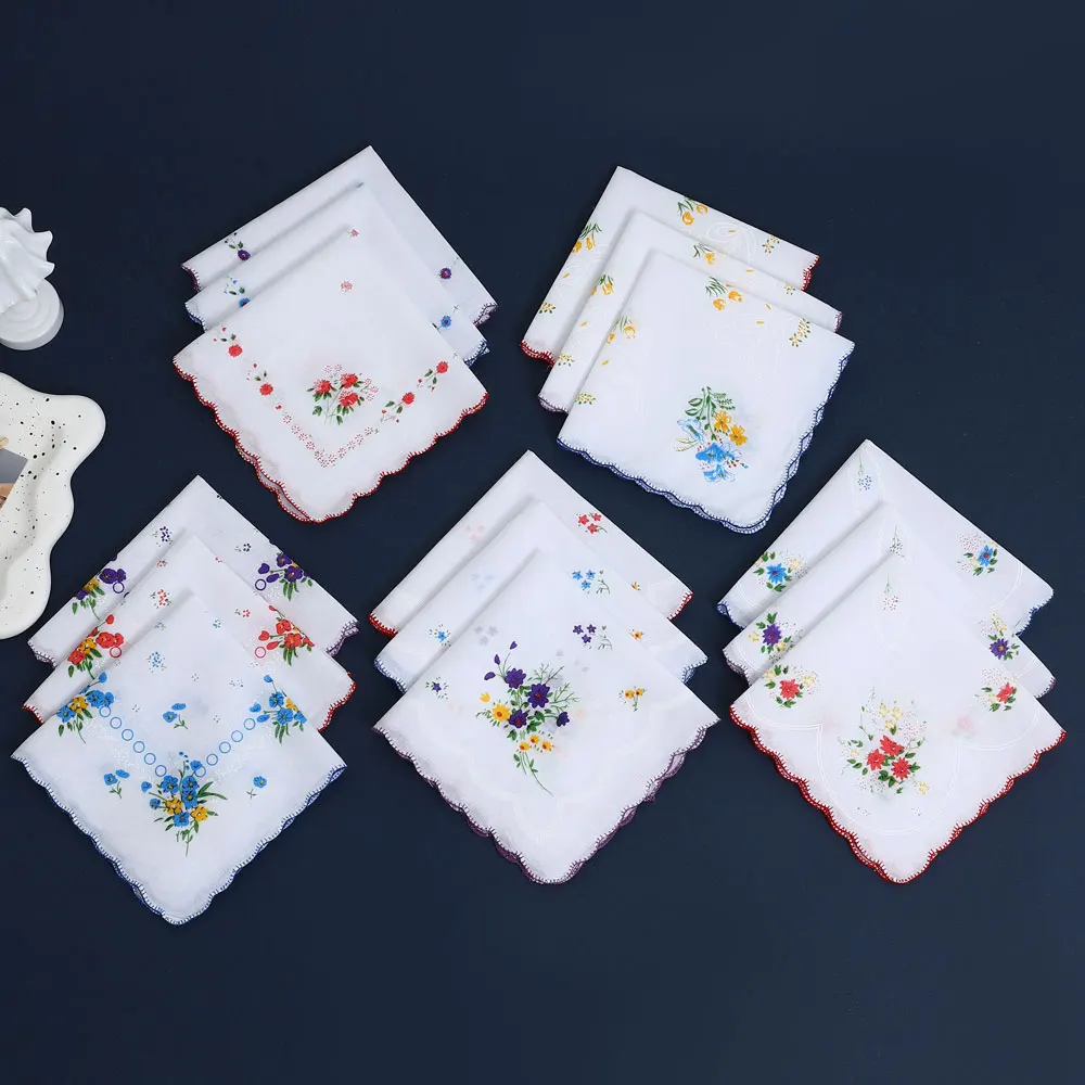 Cotton Women Hankies Printed Lace Flower Hanky For Bride Spring Style Ladies' Handkerchiefs Light Cotton Small Square Towel 3pcs