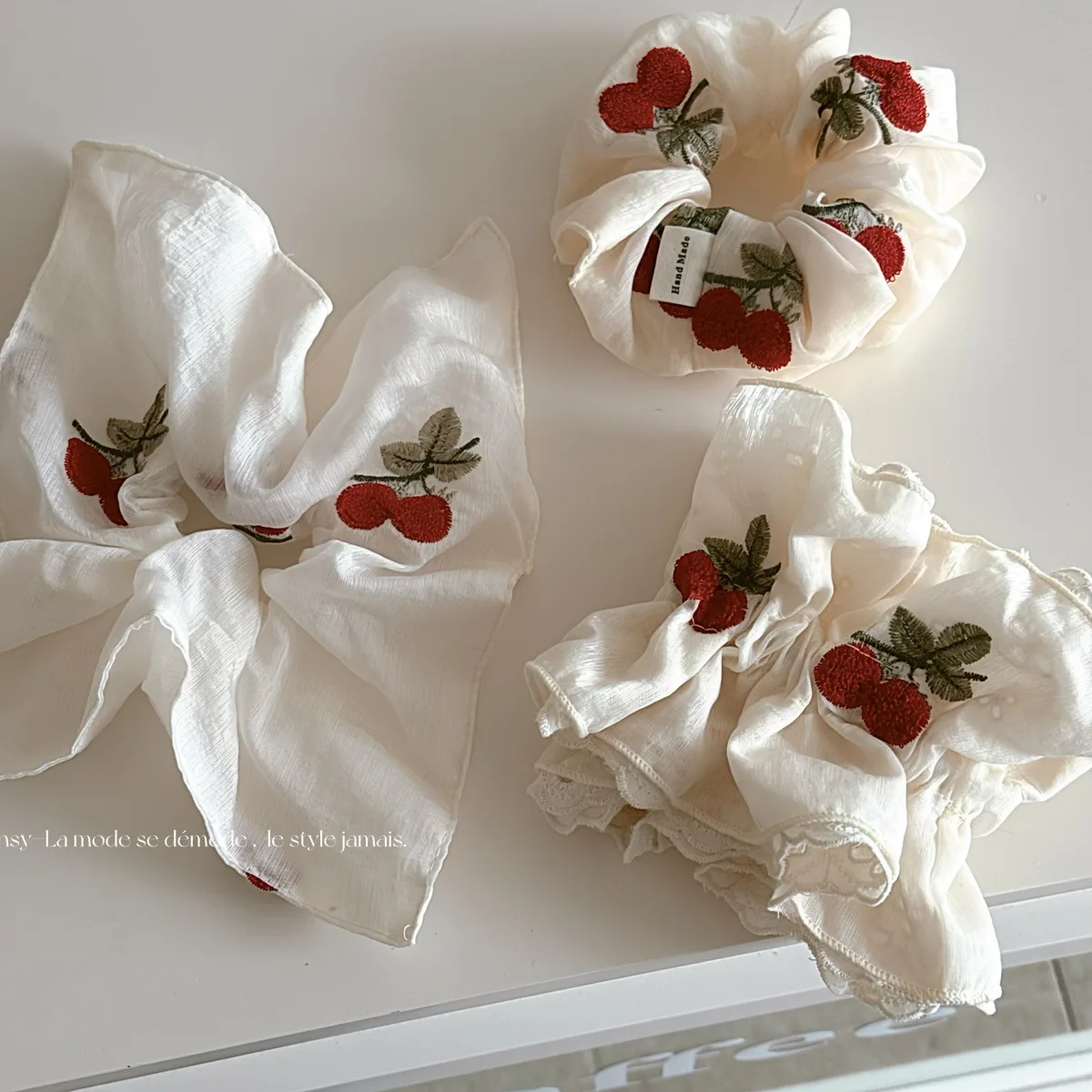 Women's Fashion Scrunchies Cherry Embroidery Lace Sweet Fresh Handkerchief Band Hair Tie Ladies Accessory Hair Tie