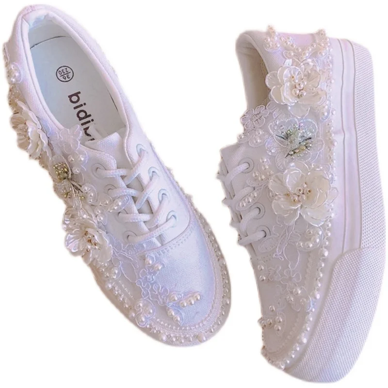 New Thick-Soled White Shoes Daisy Canvas Low-Top 3cm Internal Handmade Wedding Party White Lace Shoes Lace Sneaker