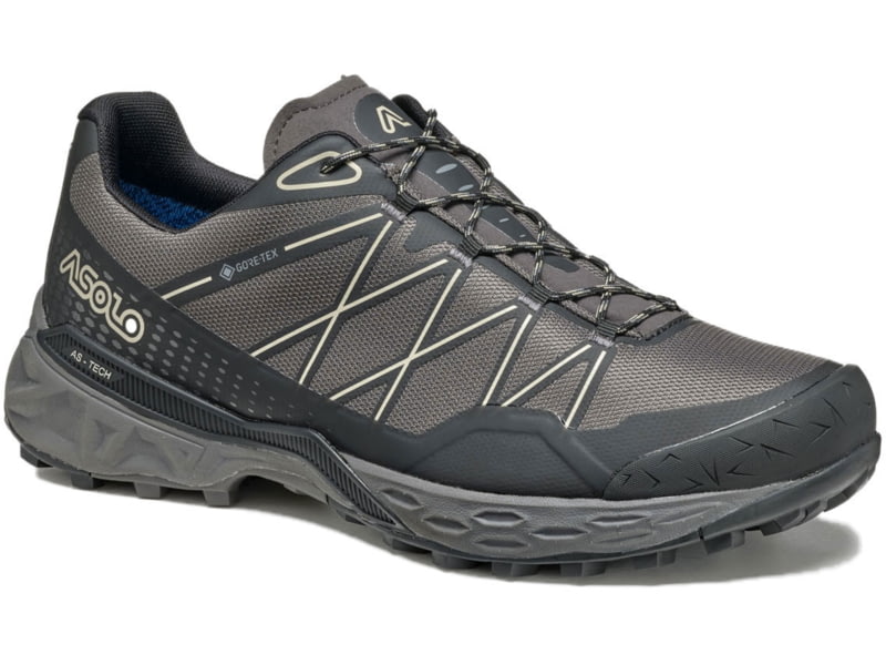 DEMO Asolo Tahoe GTX Hiking Shoes - Men's Black/Beige 9.5US B40054-B181-095. Rugged polyester uppers with protective TPU overlays let air flow freely and GORE-TEX's waterproof tech doesn't impede breathability while shedding moisture from rainfall...  Read more