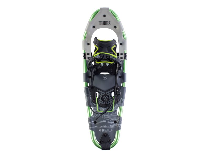 Tubbs Mountaineer Snowshoes - Men's Gray/Green 36in X190100101360. Aggressive traction is provided on two fronts by the eight teeth of the Anaconda toe crampon backed up by enhanced downhill braking from the Python heel crampon. The ActiveFit 2.0...  Read more