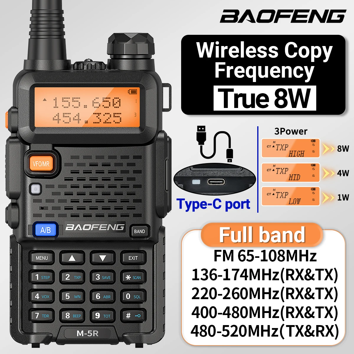 Baofeng M-5R Walkie Talkie Long Range High Power Type-C Charger Wireless Copy Frequency Air Band Commutator Ham Radio UV-5R K5