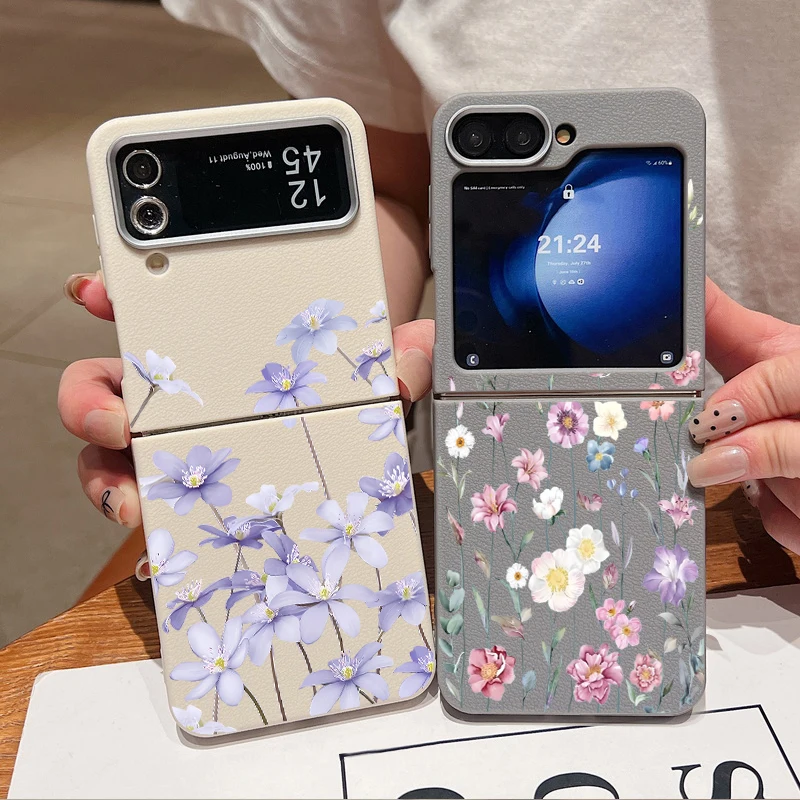 Little Flowers Phone Case For Samsung Galaxy Z Flip 7 6 5 4 3 Leather Texture TPU Folding Cover For Samsung Z Flip6 Flip5 Flip7