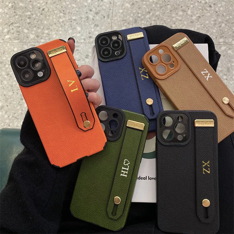 Personalise Gold Initial Letters Leather PU Wristband Cases For Iphone 15 14 11 12 13 Pro Max 16 pro promax Luxury Soft Covers