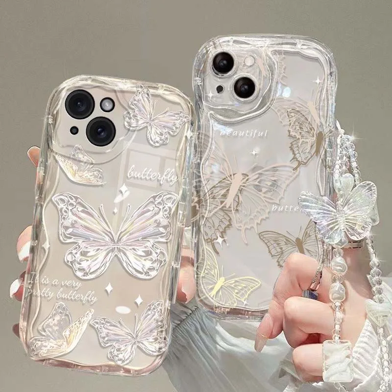 Korean Cute 3D Butterfly Bracelet Chain Phone Case For IPhone 15 16 17 Pro Max 14 11 13 12 Mini Plus 16E 17 Air Wavy Clear Cover