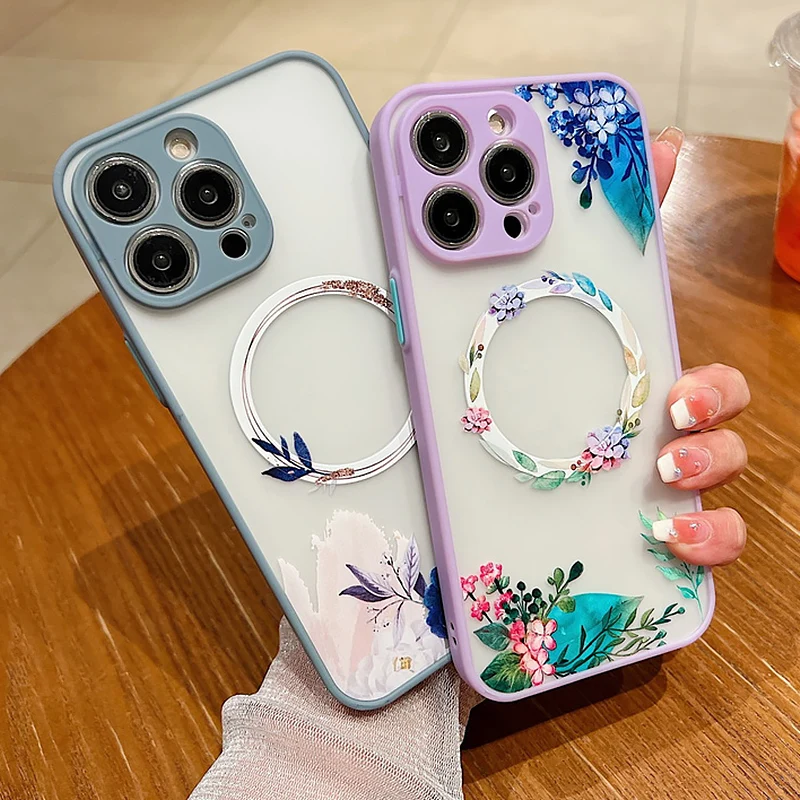 Flower Pattern Case For iPhone 17 16 13 15 Pro Max 14 12 Pro 11 Air Shockproof For Magsafe Charging Iron Ring Matte Phone Cover