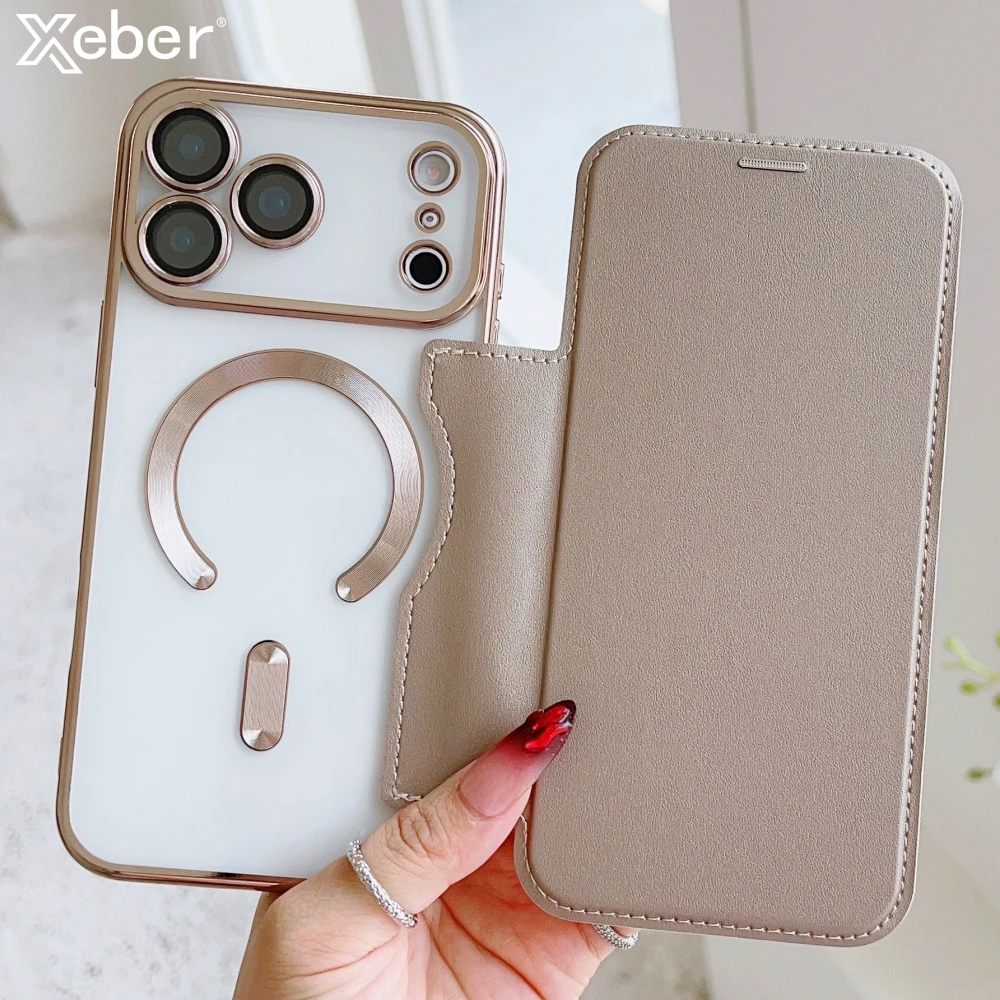 Flip Cover Plating For Magsafe Magnetic Clear Case For iPhone 17 16 13 12 11 Pro Max 15 14 Plus Leather Slot Card Wallet Cover