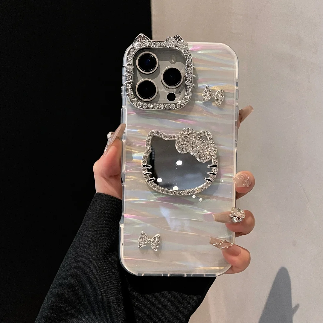 Camera protect Diamond Studded Cat mirror Kawaii Case for iPhone17 16 15 14 13 Pro Max laser Dustproof Anti Fall Silicone Cover