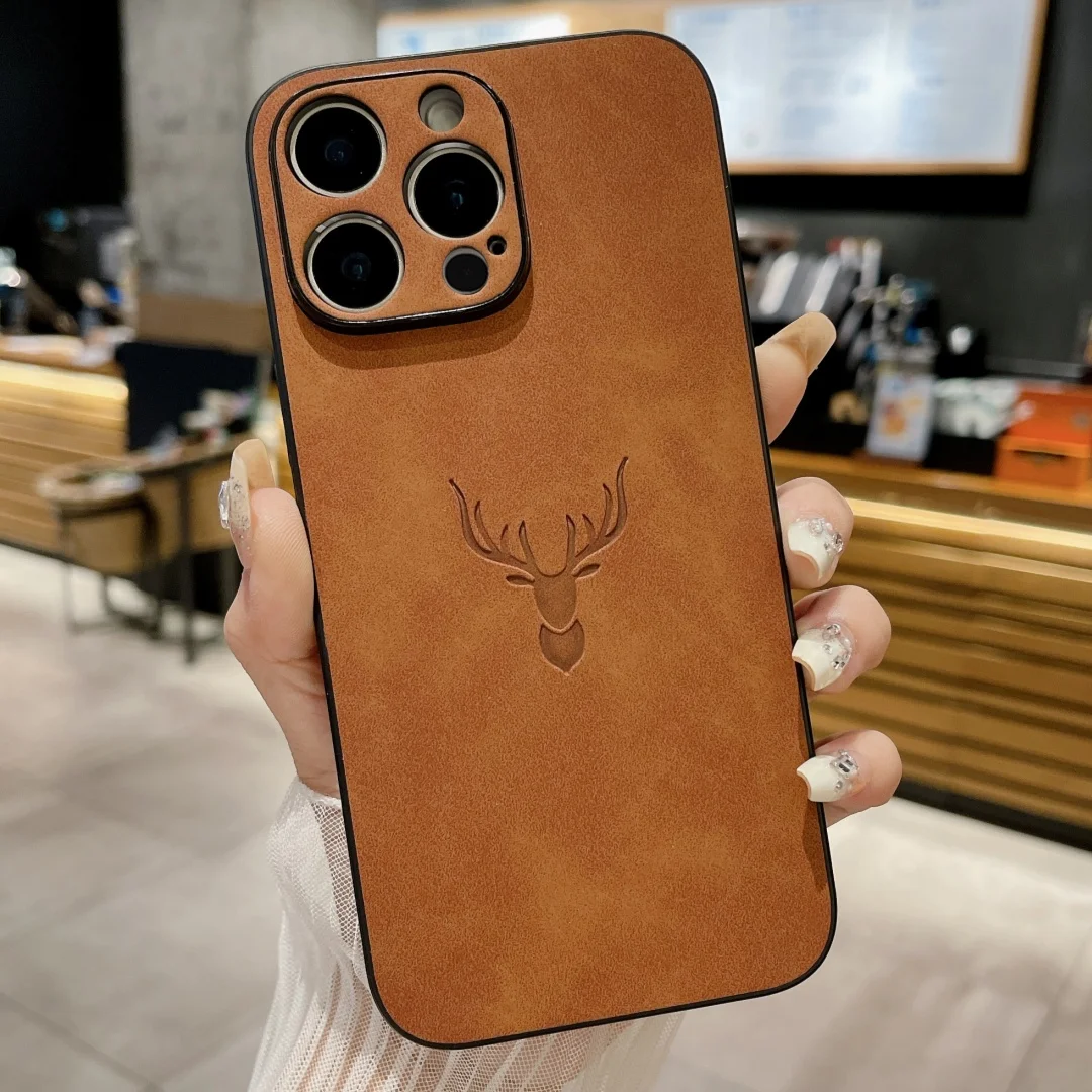 Retro Deer Pattern Leather Matte Shockproof Case For iPhone 16E 15 14 Plus 11 12 13 16 Pro Max XS XR Suede Bumper Silicone Cover