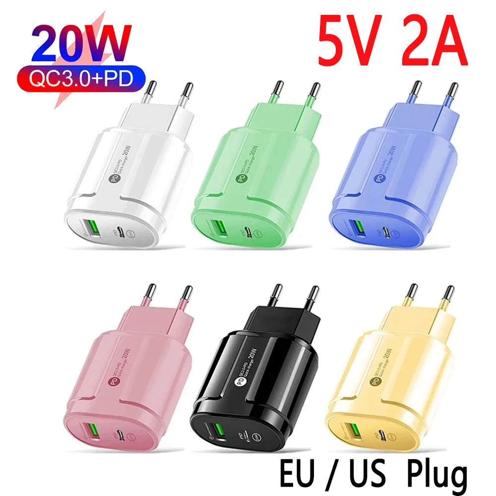 1pc 20W Charger Fast Charge 5V 2A USB Type-C Charger Dual Ports Wall Travel Charger Macaron Color EU US Plug for IPhone Huawei