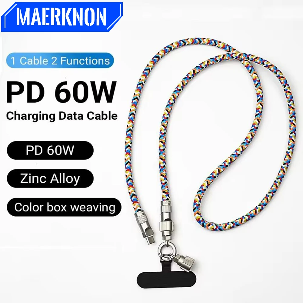 USB C to USB C PD 60W 2 in 1 Phone Anti-Loss Lanyard Fast Charging Cable Quick Charge Type C Data Cord For iPhone Samsung Xiaom