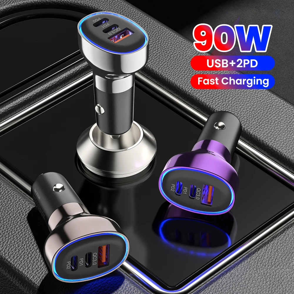 3-Port 90W Car Charger Fast Charging USB+2PD Car Lighter USB Type C Car Phone Charger Adapter for iphone Samsung Xiaomi Huawei