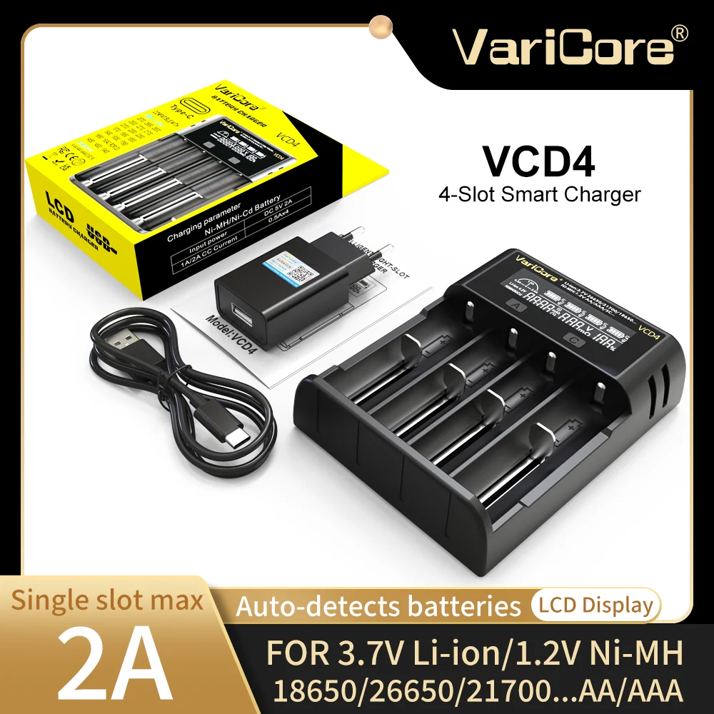 Varicore 18650 Battery Charger VCD4 V20i for NiMH Li-ion 3.7V 1.2V 26650 26700 14500 26700 18350 21700 AA AAA