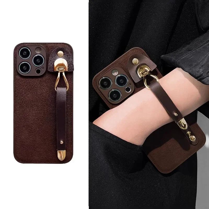 2025 Leather Pattern Wrist Strap Case For iphone 16 15 14 13 12 11 Pro Max XR X Xs Max Luxury Plain Color Shockproof Phone Cover