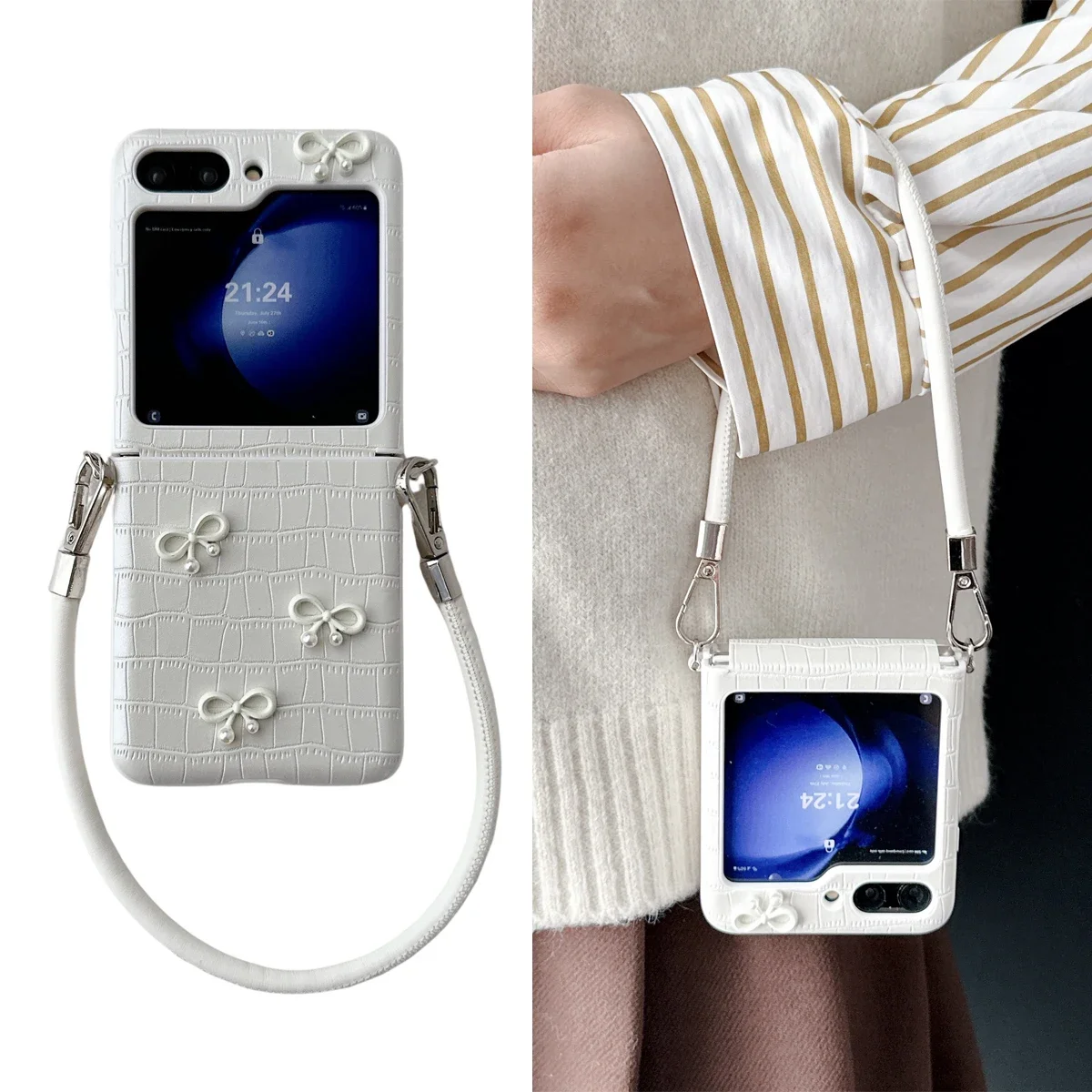 Bow Alligator Pattern PU Leather Wrist Strap Phone Case for Samsung Galaxy Z Flip 7 6 5 4 3 ZFlip7 Protection Shockproof Cover