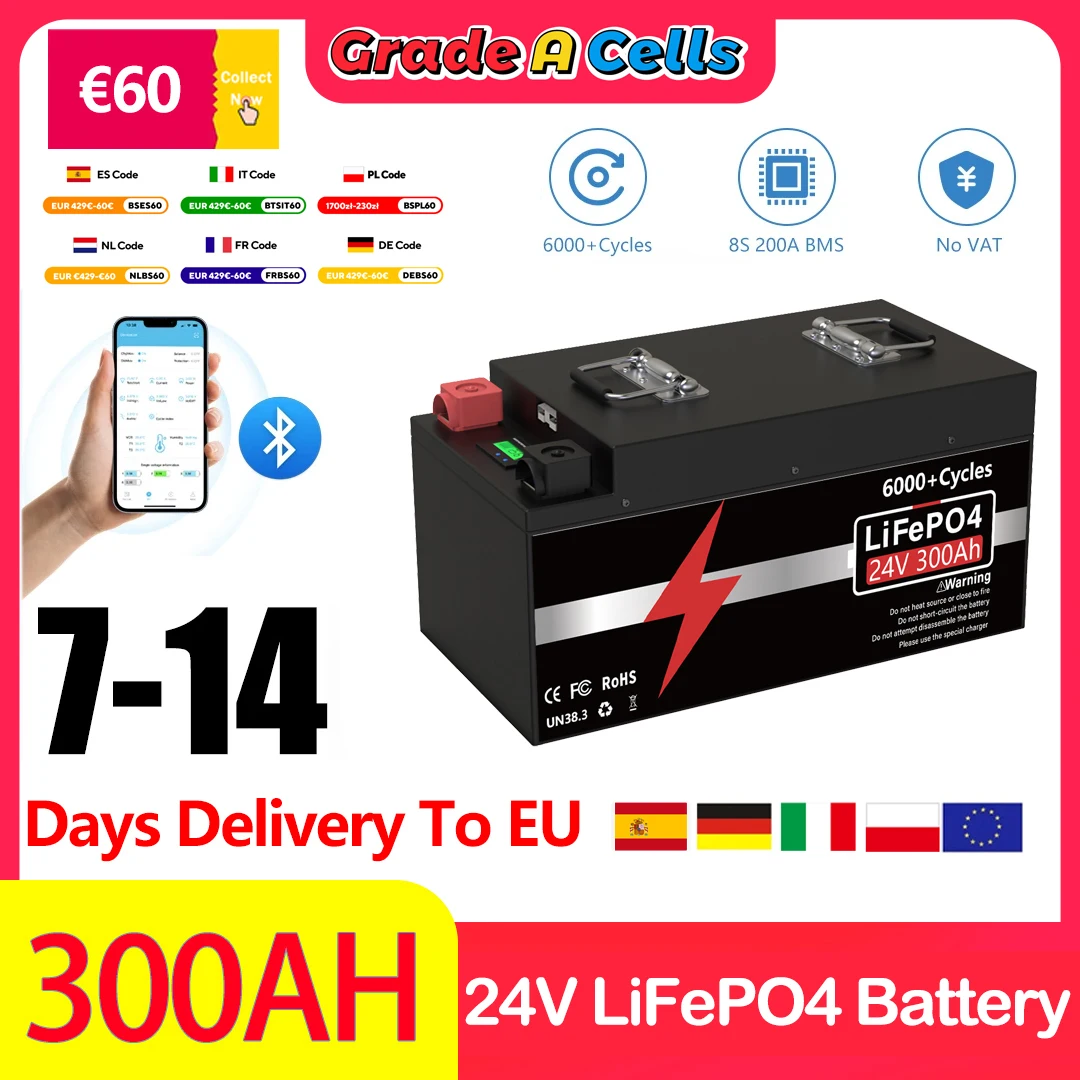 LiFePO4 Battery 24V 300Ah 200Ah 100Ah Buletooth 200A BMS 25.6V 7KW 6000+ Cycles Grade A Cells For RV Boat Solar EU Fast Delivery
