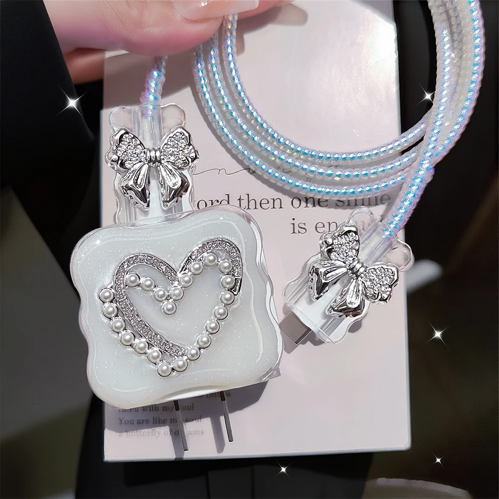 Cute Pearl Love Heart Bow Electroplating Silver USB Protector Cover For iPhone 18W-20W Data Line Head Cord Fast Charging Case  Read more