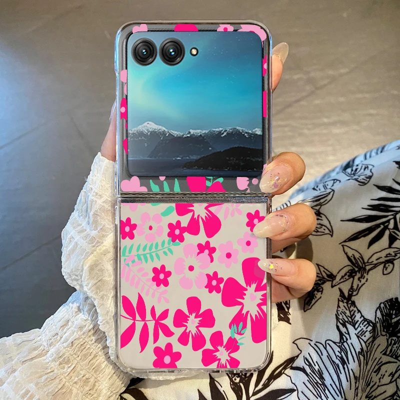 Pink Flowers Print Clear Phone Case For Motorola Razr 50 40 Ultra Razr40 Razr50 Shockproof Bumper Transparent Folding Hard Cover