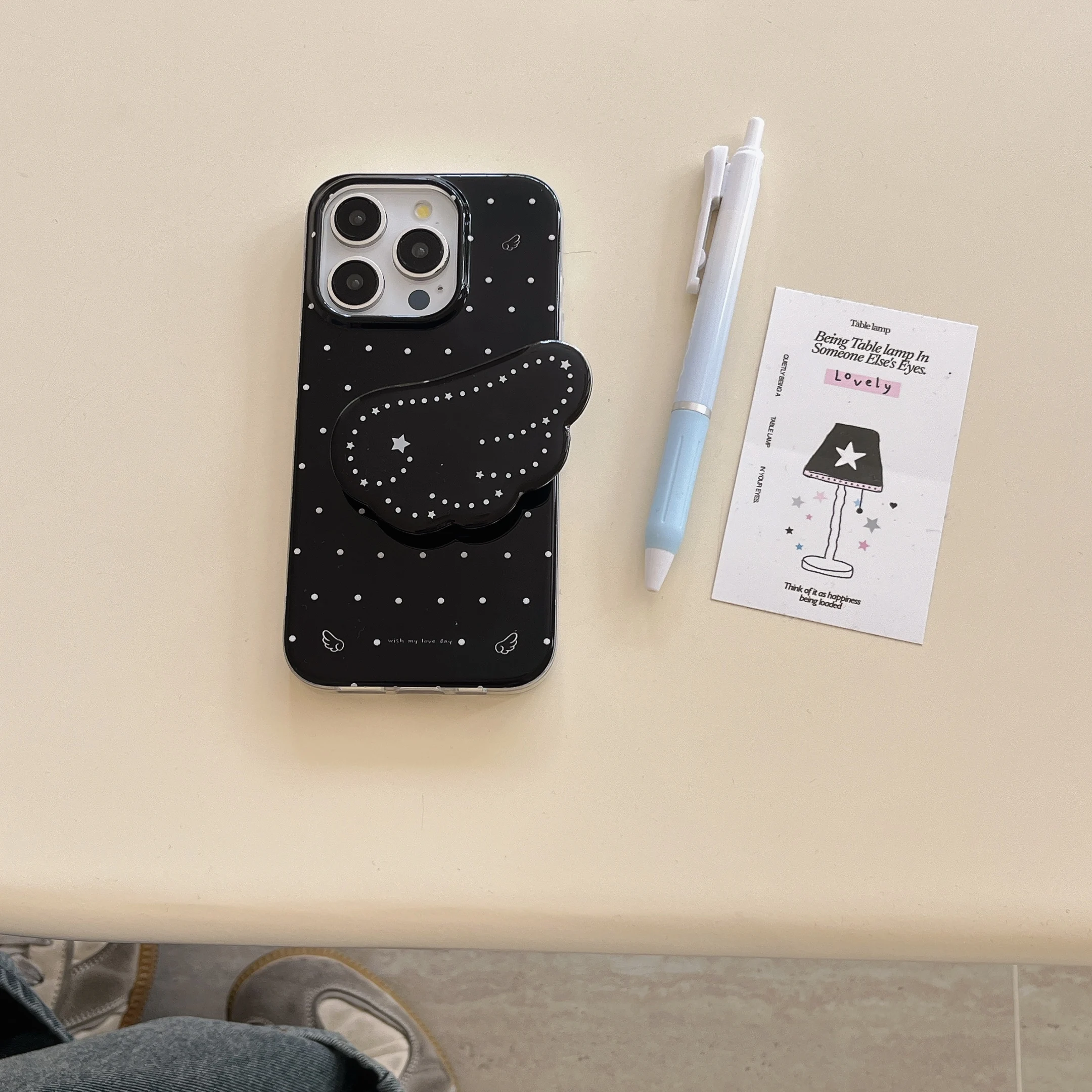 Ins Black Polka Dots Stars Wing Bracket Phone Case for iPhone 16 15 14 13 Pro Max Back Cover Funda