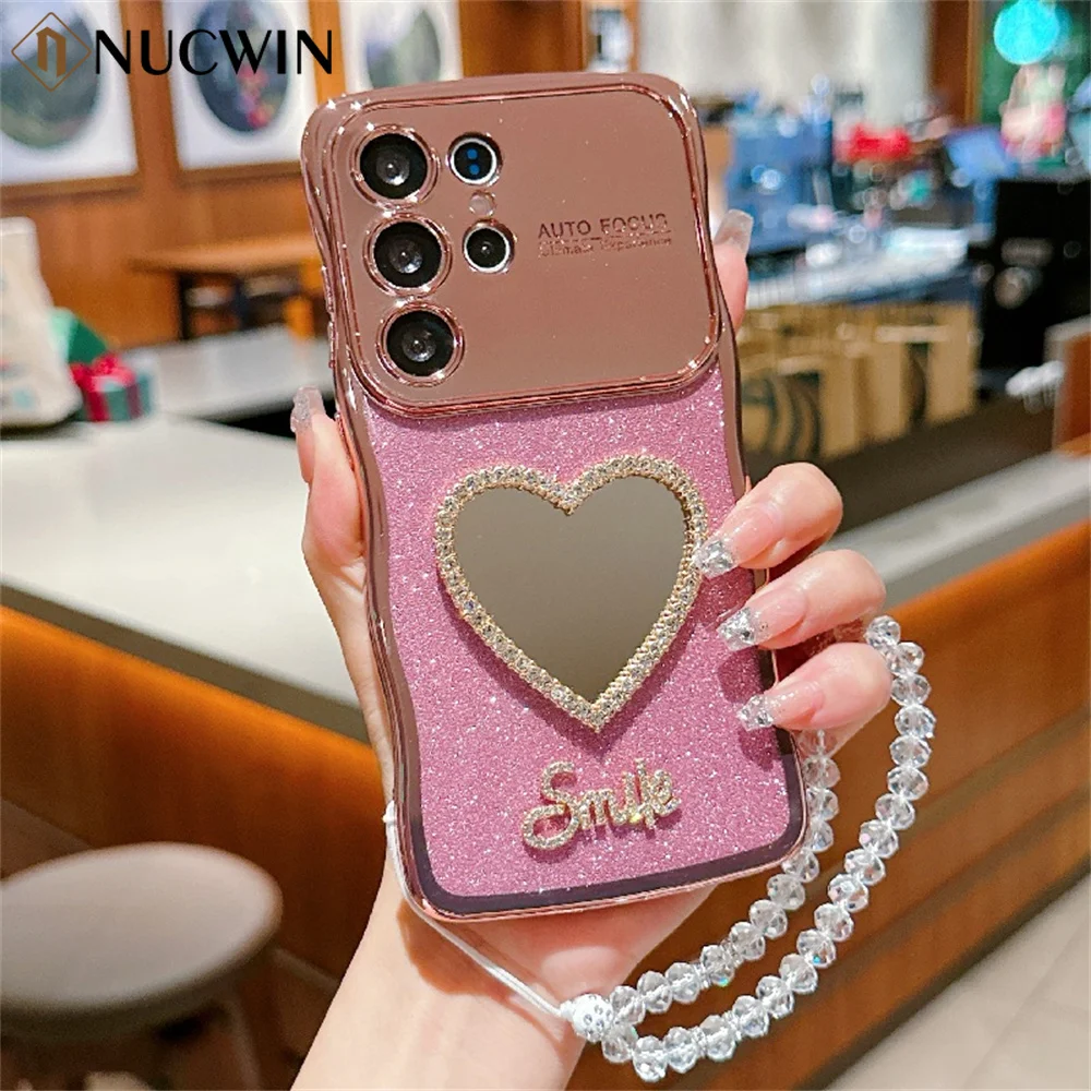 Women Girl's Love Heart Makeup Mirror Case for Samsung Galaxy S24 S25 Ultra S22 Plus S23 FE With Crystal Wrist Chain Shiny Cover
