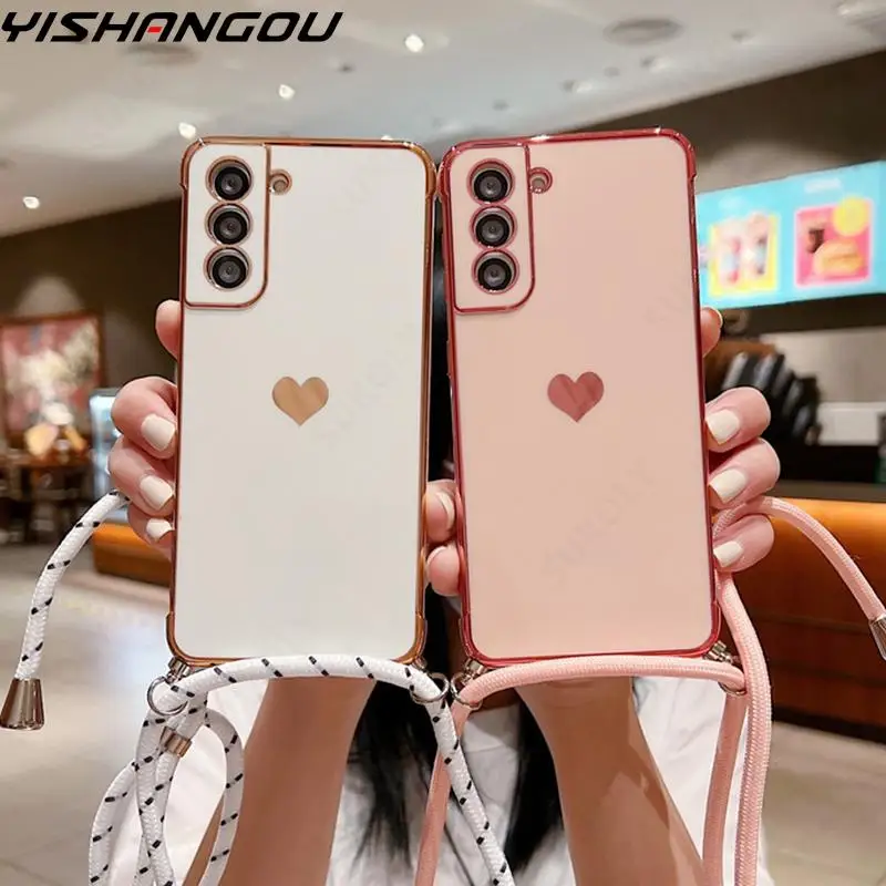 Crossbody Strap Cord Phone Case For Samsung Galaxy S25 S23 S24 Ultra S24 FE A17 A15 A16 A55 A54 5G Plating Heart Lanyard Cover