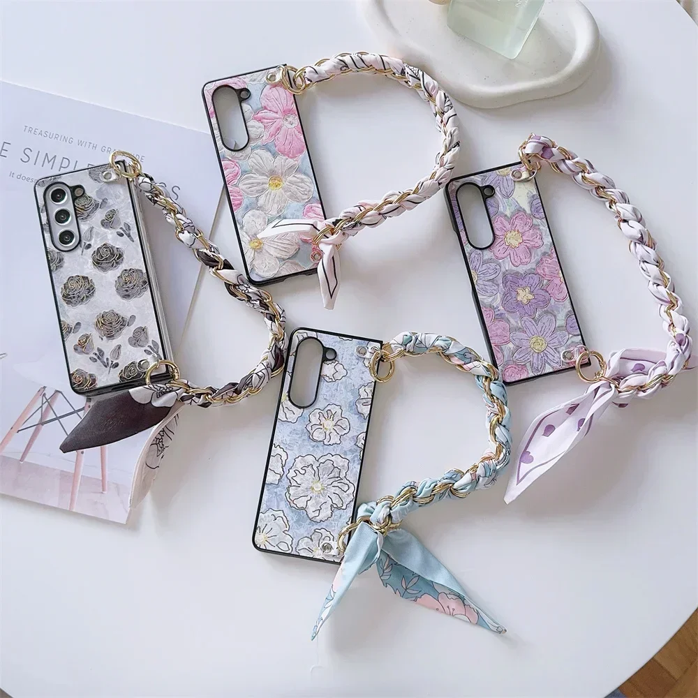 Golden Flower PU Leather Cover with Scarf Handbag Style Chain Wrist Strap For Samsung Galaxy Z Fold 7 6 5 4 3 5G Hard Phone Case