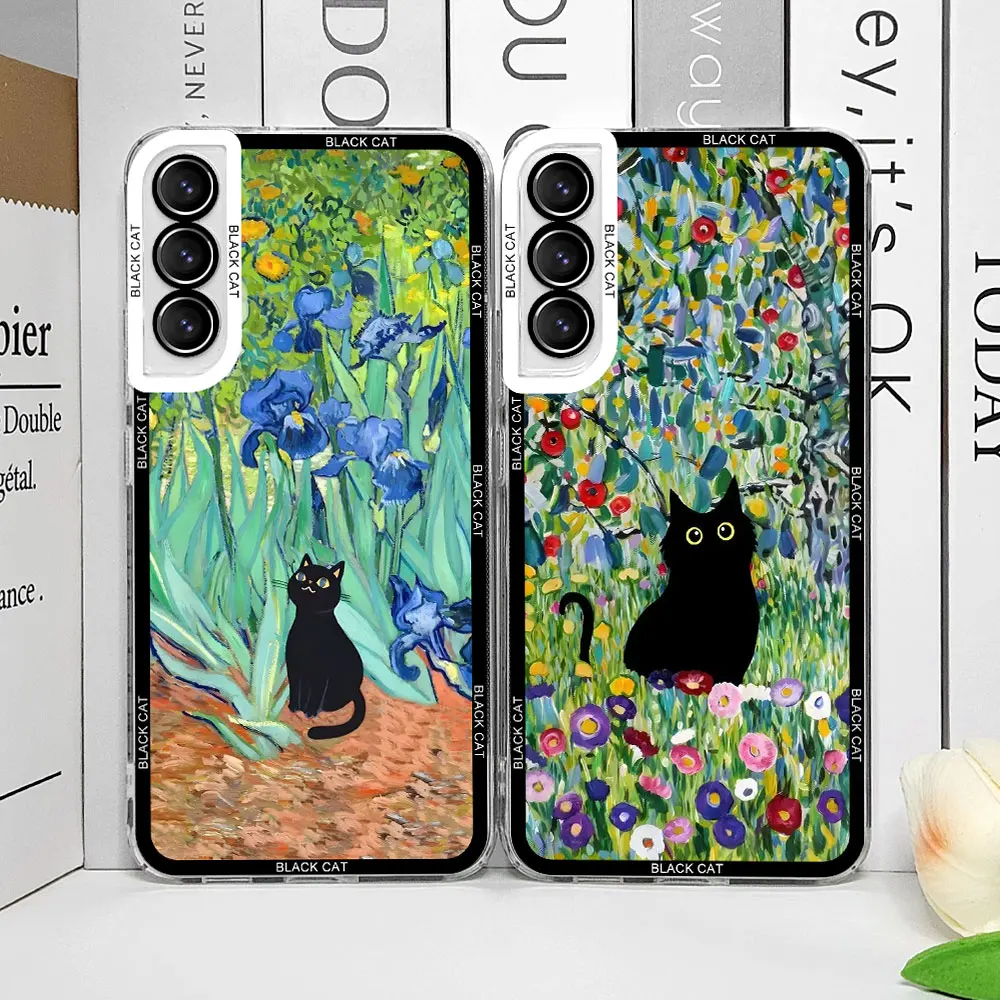 Retro Oil Painting Van-Gogh Flower Art Cat Phone Case for Samsung Galaxy S25 S24 S23 Ultra S22 Plus S21 FE 5G Clear Cover Fundas