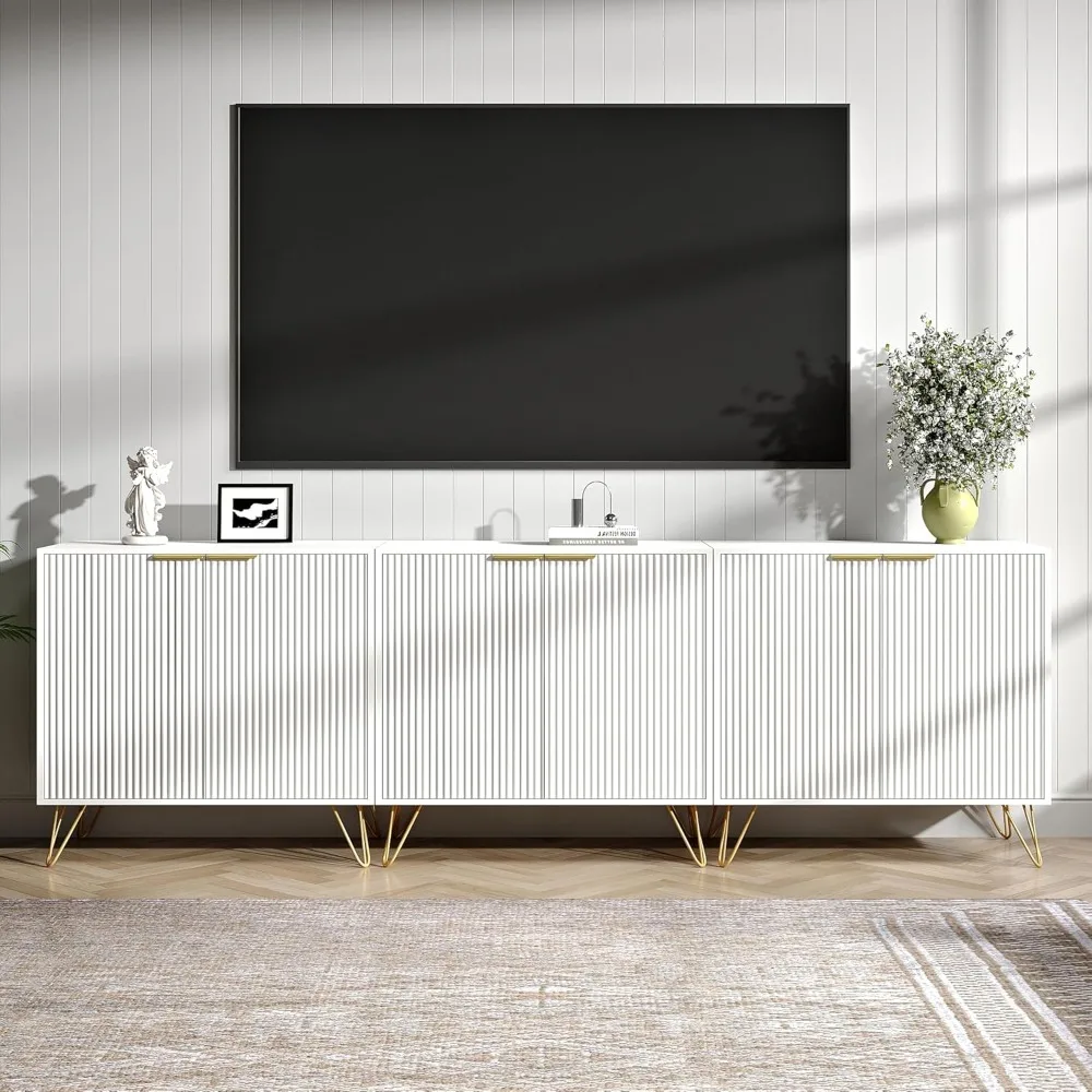 Fluted TV Stand for 90 Inch TV, Modern TV Stand Console, White Entertainment Center with 3 Storage Cabinets, Adjustable Shelves