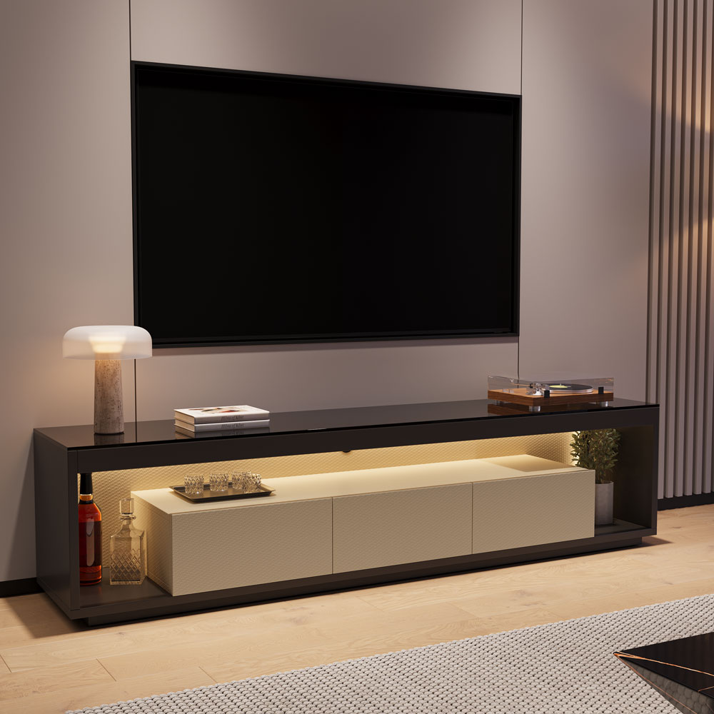 79" Modern Low Profile TV Stand with Glass Tabletop, Luxury TV Stand with LED Lights & Storage, Perfect for 75 Inch TVs, Fully Assembled