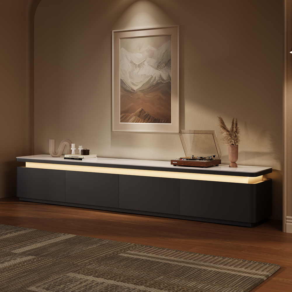 94.49"Mid-Century Modern Glossy Sintered Stone Tabletop TV Stand, Black Tambour Door Media Console, Rolling Door TV Console