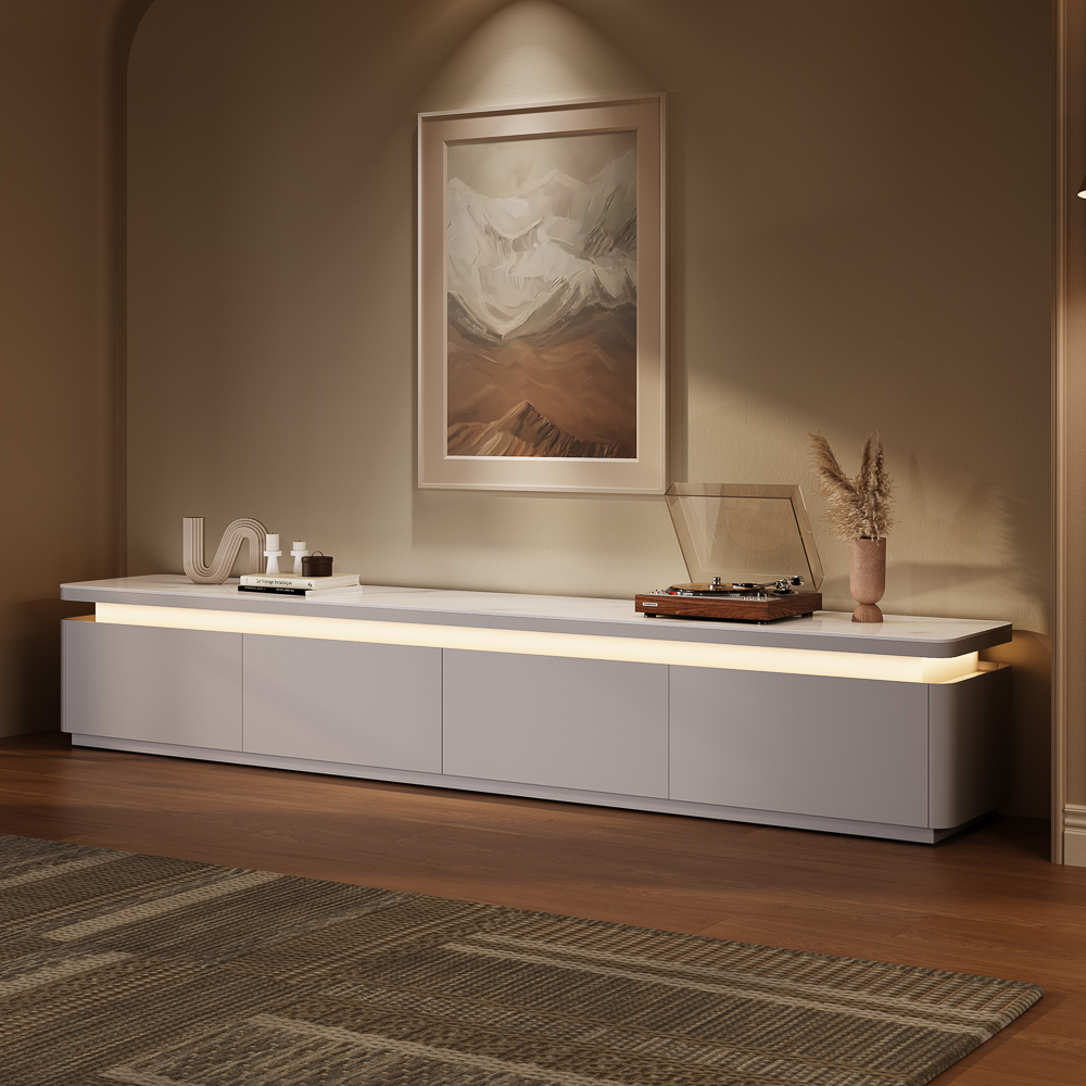 95" Modern TV Stand with Adjustable LED Lights, Long TV Console with Glossy Sintered Stone Tabletop, Drop-Down Doors & Drawers, Open Storage for Living Room, Perfect for 85 Inch TVs, Fully Assembled