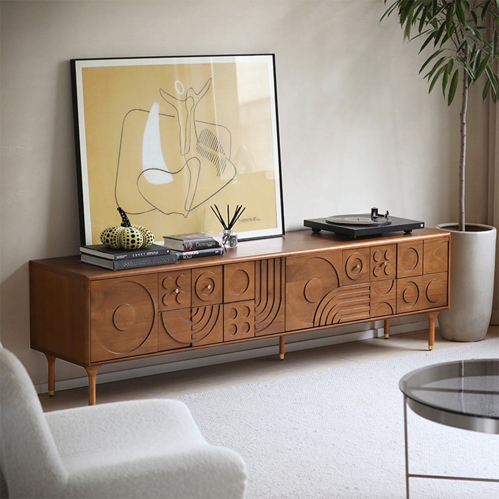 [Engraving Design]The TV Stand utilizes a handcrafted distressing technique, creating an uneven effect that mimics the natural beauty of wood aging over time in nature. This design boldly combines modern elements with retro style, featuring 3D...
