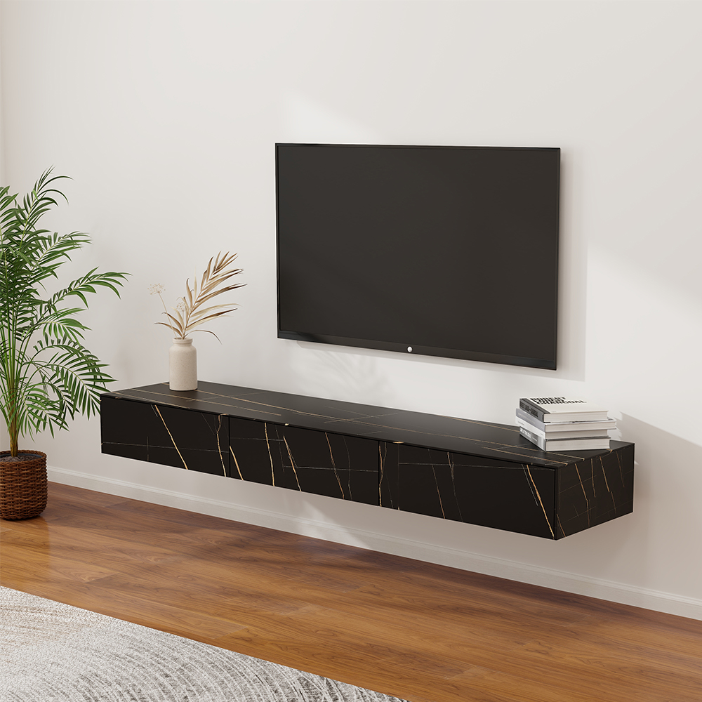Modern Wall-Mounted TV Stand, Black Floating TV Cabinet with Drawers Matte Sintered Stone, Storage, Flip-down Door, Wall Hung, 70.87"