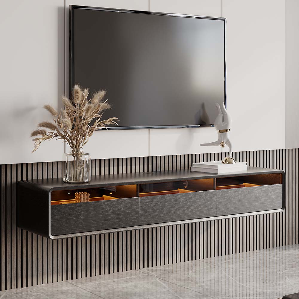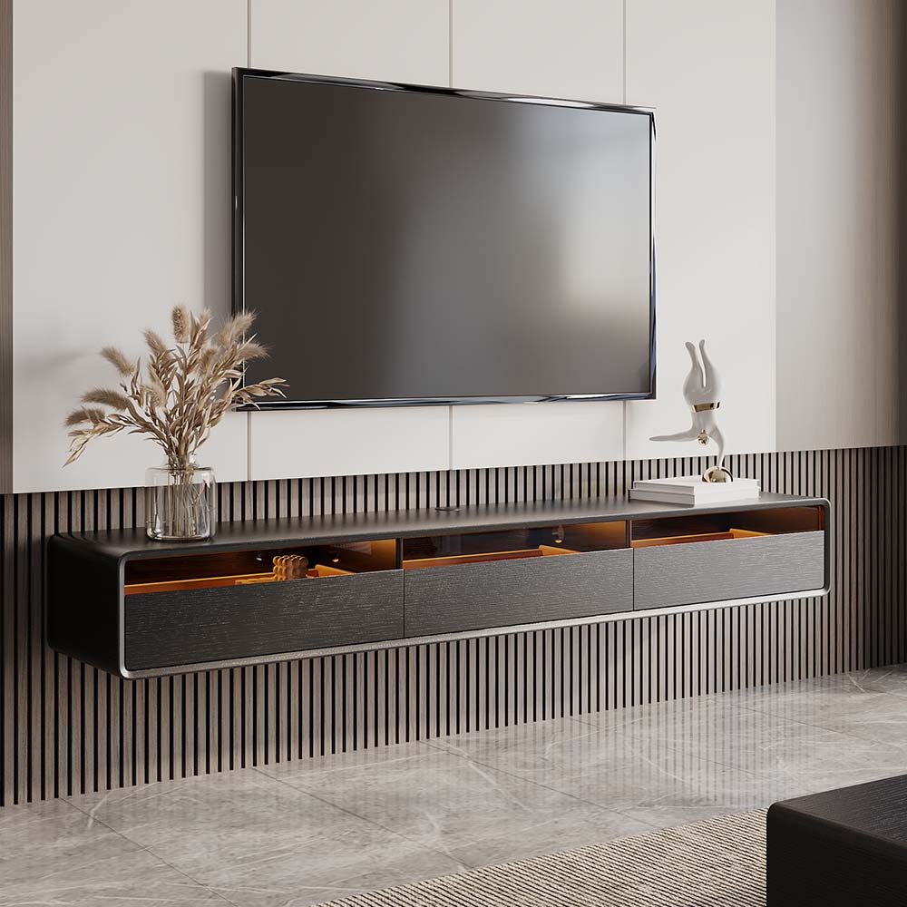 [Round Edge Design]Suspension TV stand is designed with rounded edges, which are softer compared to the right-angle design, and can reduce the damage that may be caused in case of accidental collision.[Ambient Light Strip]Equipped with a warm yellow...