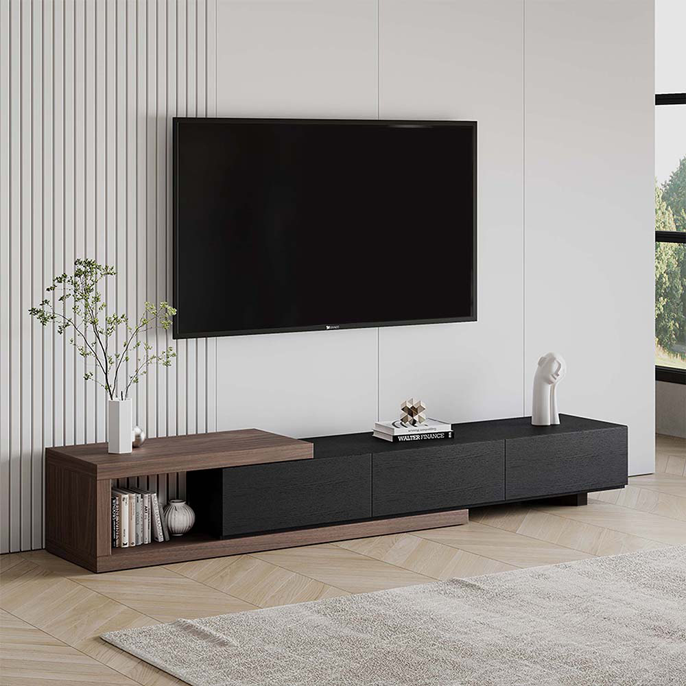 Modern Retractable Wood TV Stand with 3 Drawers, Open Storage, Walnut and Black, 70.86"