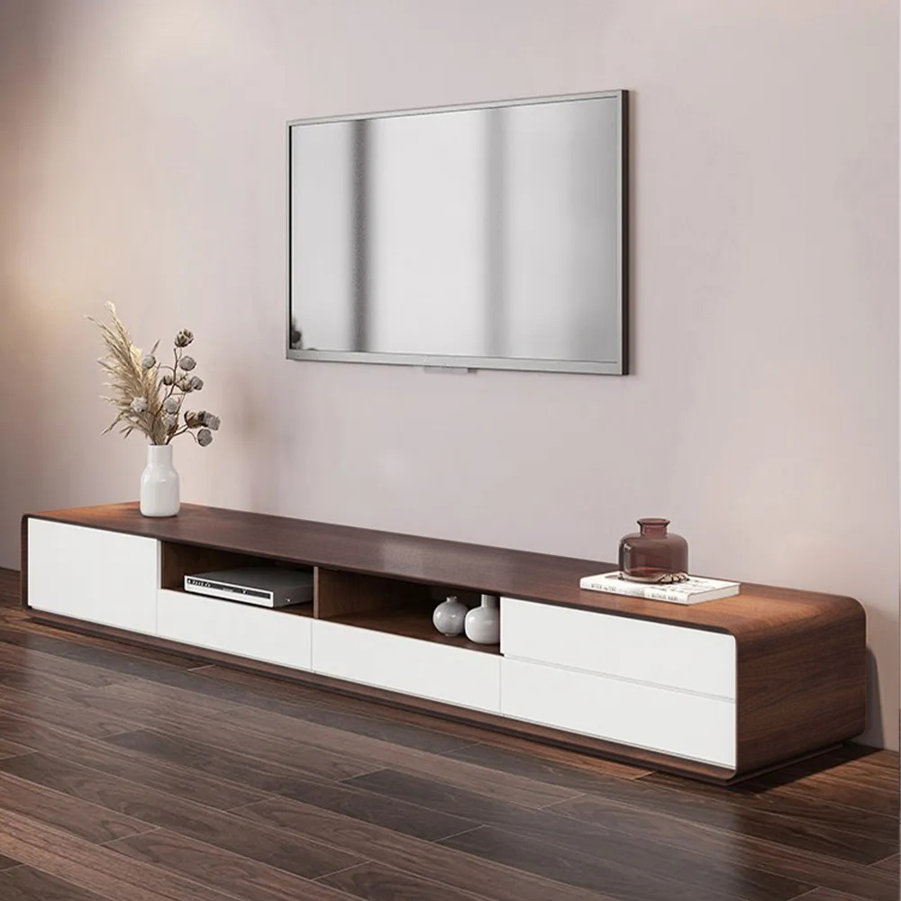 Modern Wood White TV Stand, Lowline Media Console with 4 Drawers, Open Storage Cabinet, Walnut Veneer, Fully-assembled, 78"