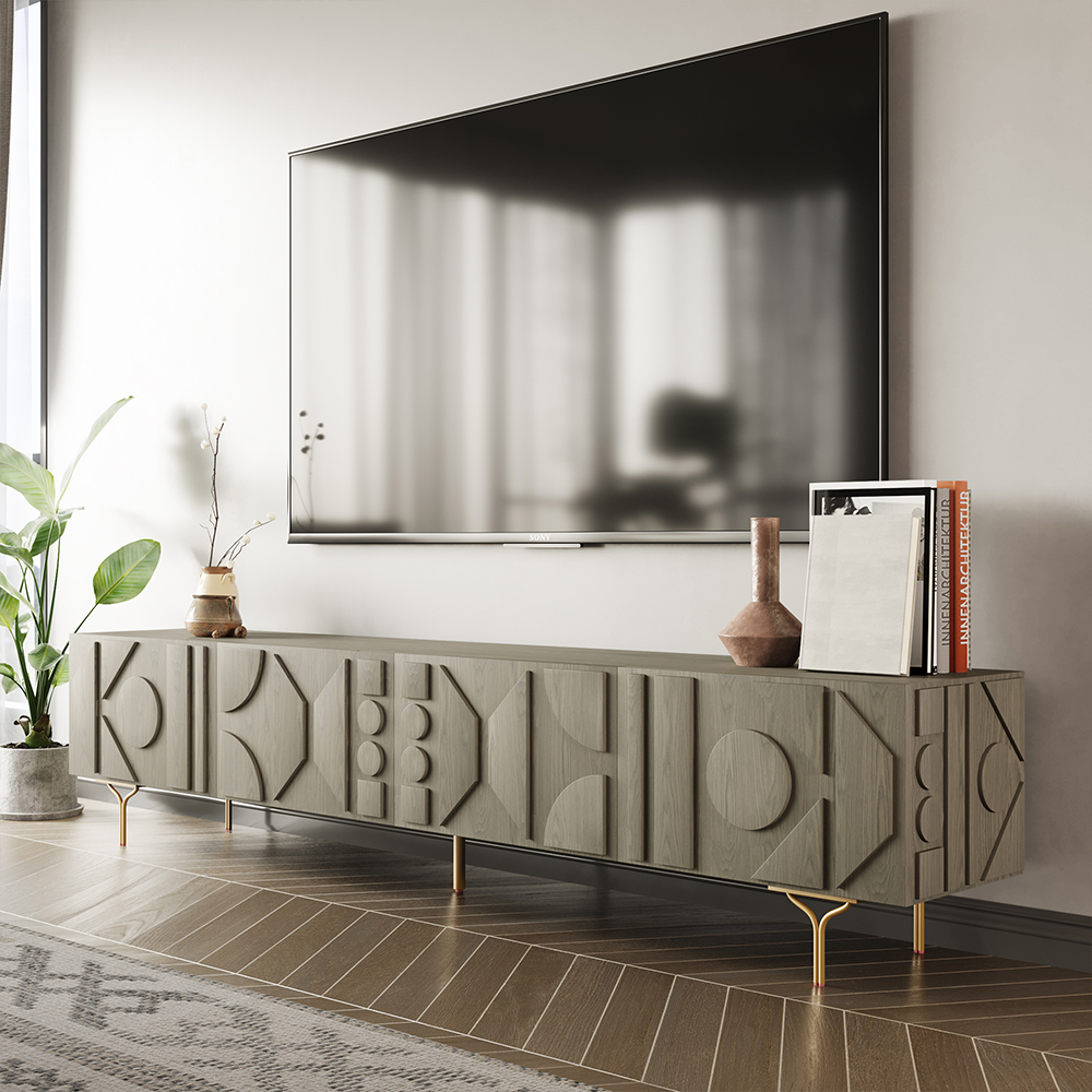 94.49" Mid-Century Modern TV Stand, Red Oak Veneer, Grey TV Console, Wood Media Console, Metal Legs, Perfect for 85-inch TVs