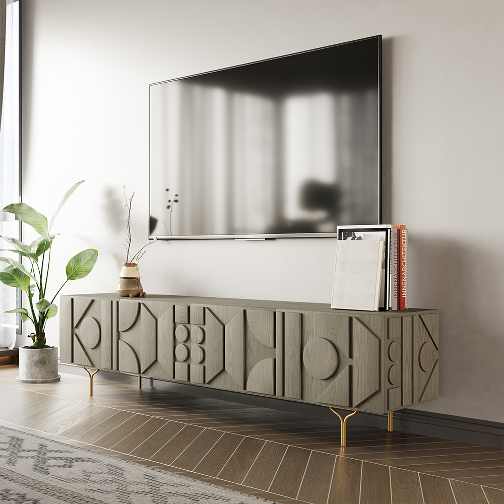 78.74" Mid-Century Modern TV Stand, Red Oak Veneer, Grey TV Console, Wood Media Console, Metal Legs, Perfect for 75-inch TVs