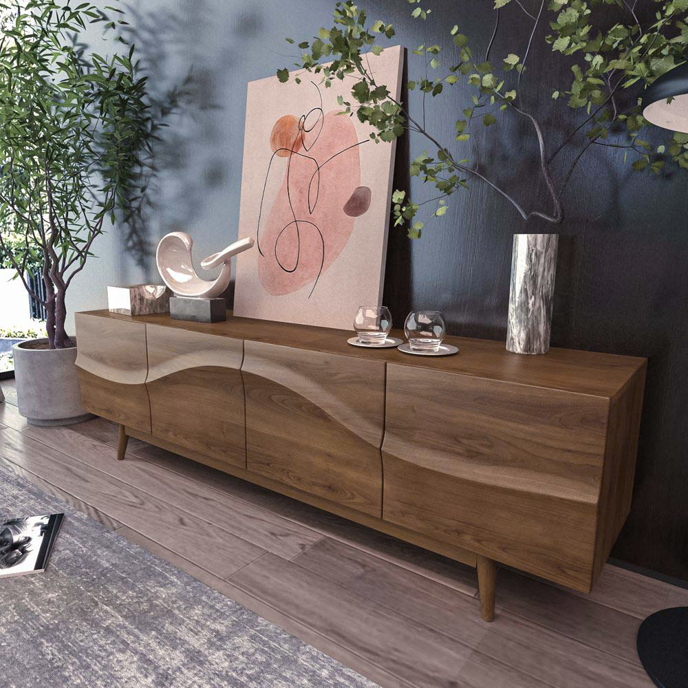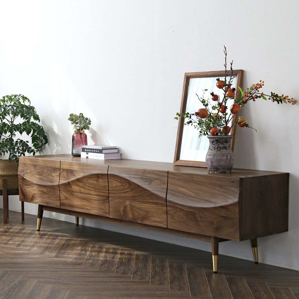 [Modern Design]Blending mid-century design elements with ample storage, this TV stand streamlines your streaming sessions. The cabinet doors showcase an understated wave-like flow pattern and walnut wood grains, while cutouts inside conceal cables....