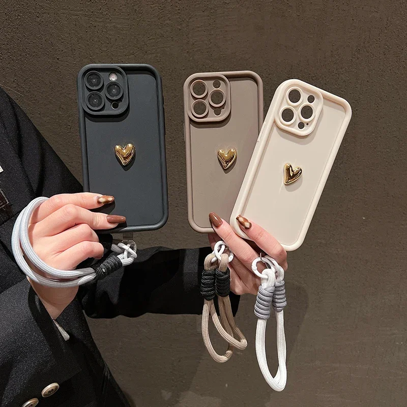 3D Gold Heart Soft Lanyard Rope Phone Case For iPhone 17 16 15 14 13 12 11 Pro Max X XS XR 7 8 Plus Hand Strap Shockproof Cover