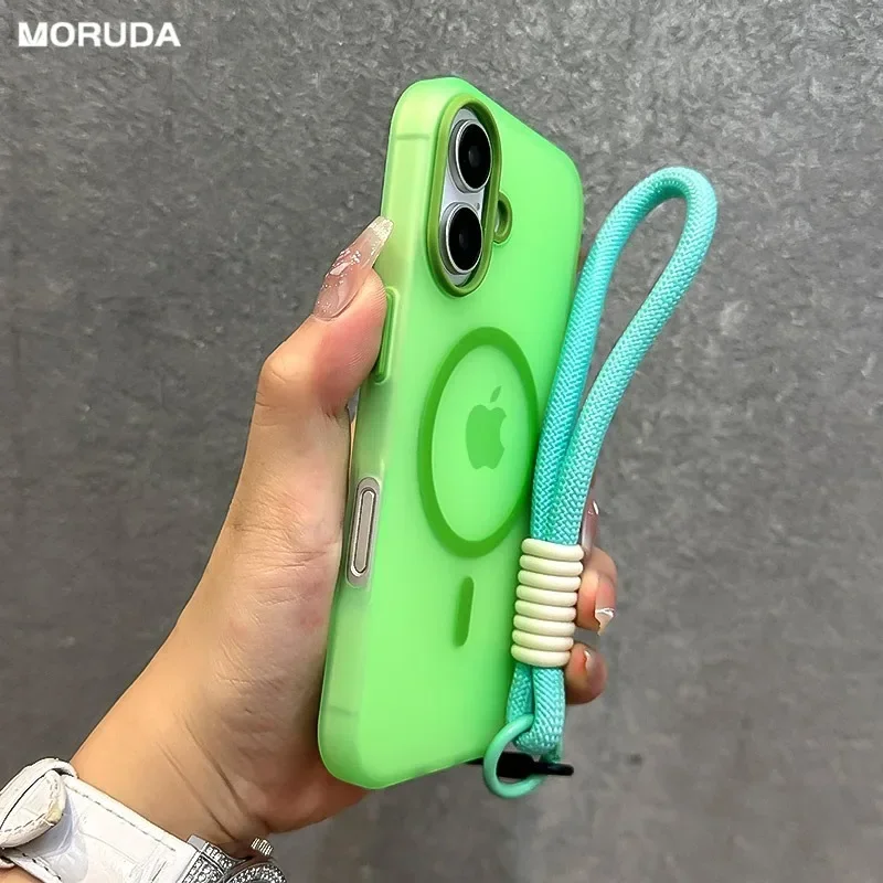 for Magsafe Candy Color Contrast Lanyard Case for iPhone 16 15 17 Pro Max 14 Plus 11 12 13 16e Hand Wrist Strap Matte Soft Cover