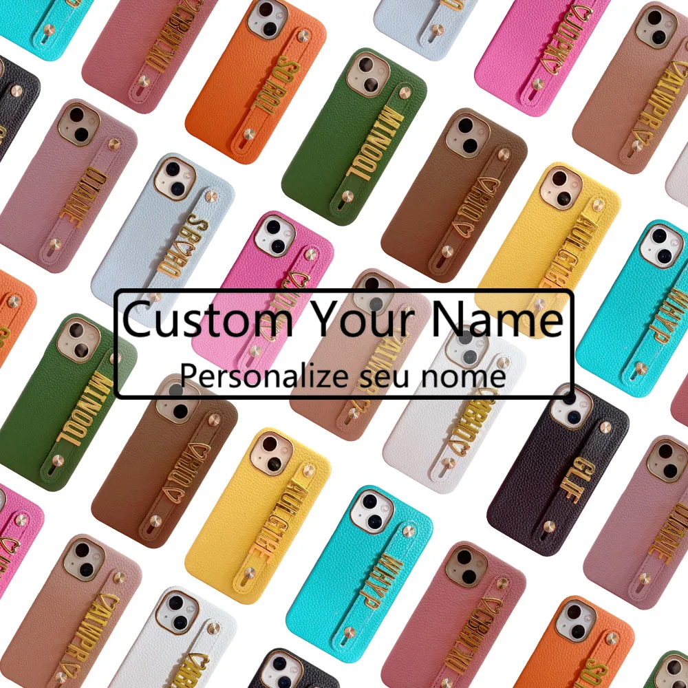 Holding Strap Personalised Custom Name Gold Metal Letters Leather Phone Case For Iphone 16 15Pro 14 13 12 11 Pro Max Plus Cover