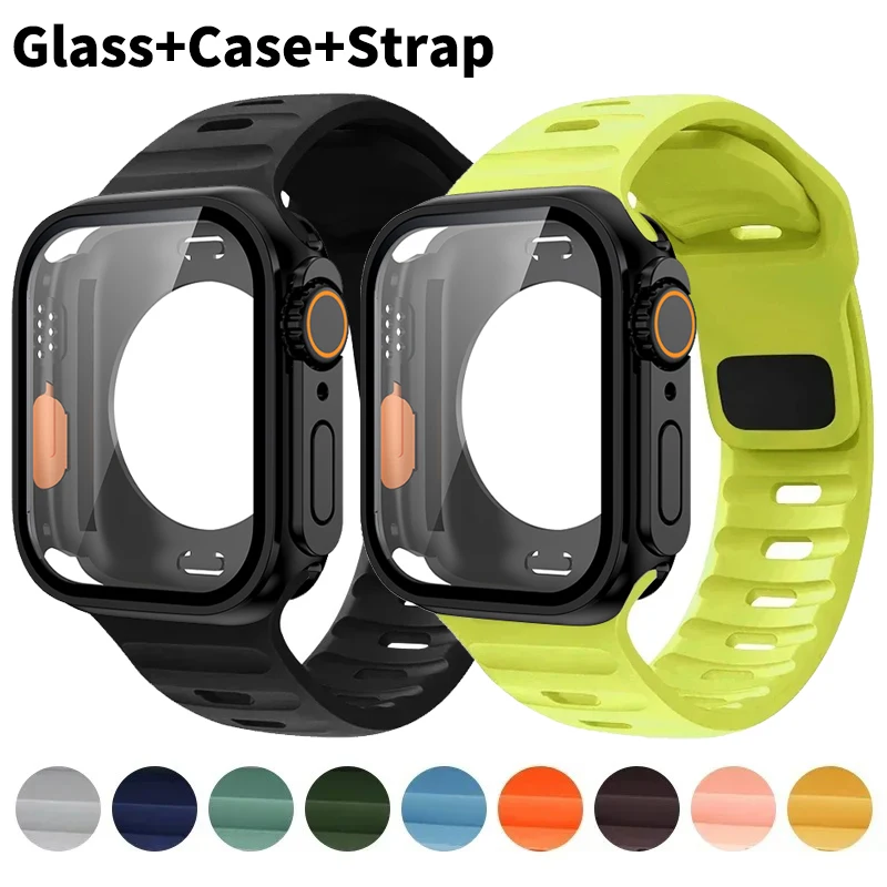 Silicone strap+Glass case For Apple Watch Band 46mm 40 41 44 45 Screen Protector Change to Ultra Frame For iWatch 10 9 8 7 6 SE