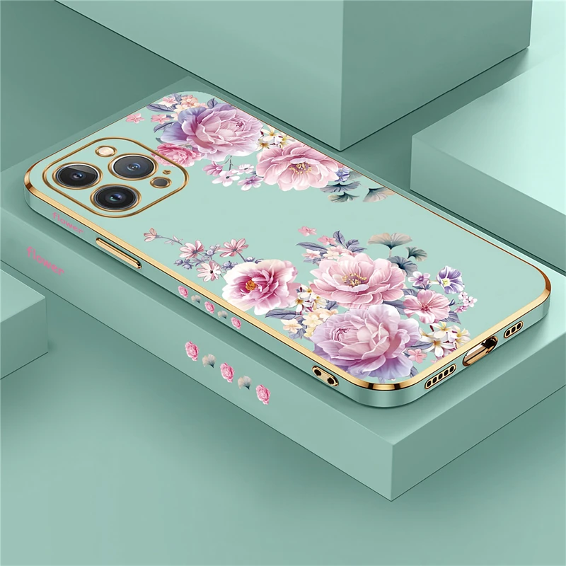 Luxury Flowers Case For iPhone 15 13 14 Pro Max 12 11 Pro XS Max XR X 8 7 14 Plus SE 2022 2020 Plating Soft Shockproof Cover