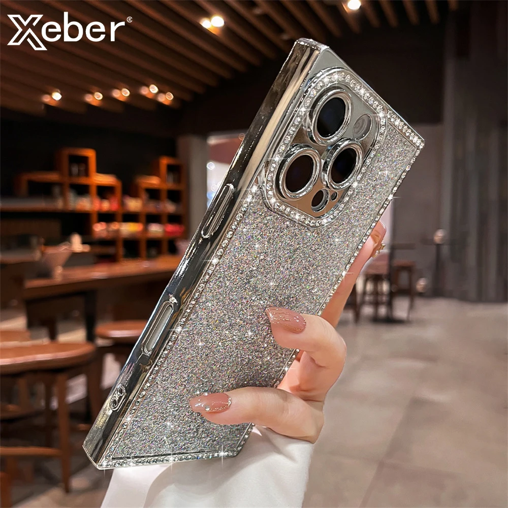 Luxury Rhinestone Squares Bling Glitter Phone Case For iPhone 17 Air 16 15 Plus 14 13 Pro Max Plating Bumper Shockproof Cover