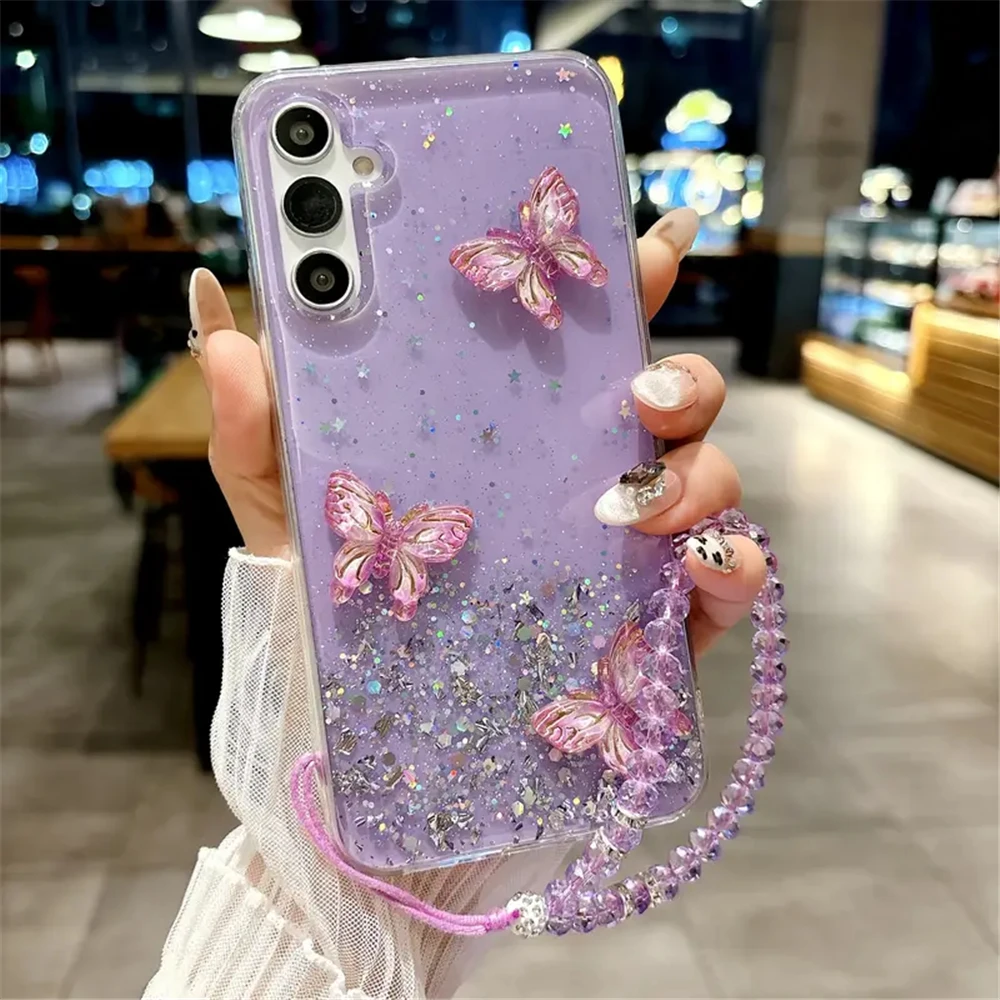 Luxury Bling Glitter Lanyard Phone Case For iPhone 17 16 15 14 13 12 11 Pro Max 16 15 14 Plus 16E 17 Air 3D Butterfly Soft Cover