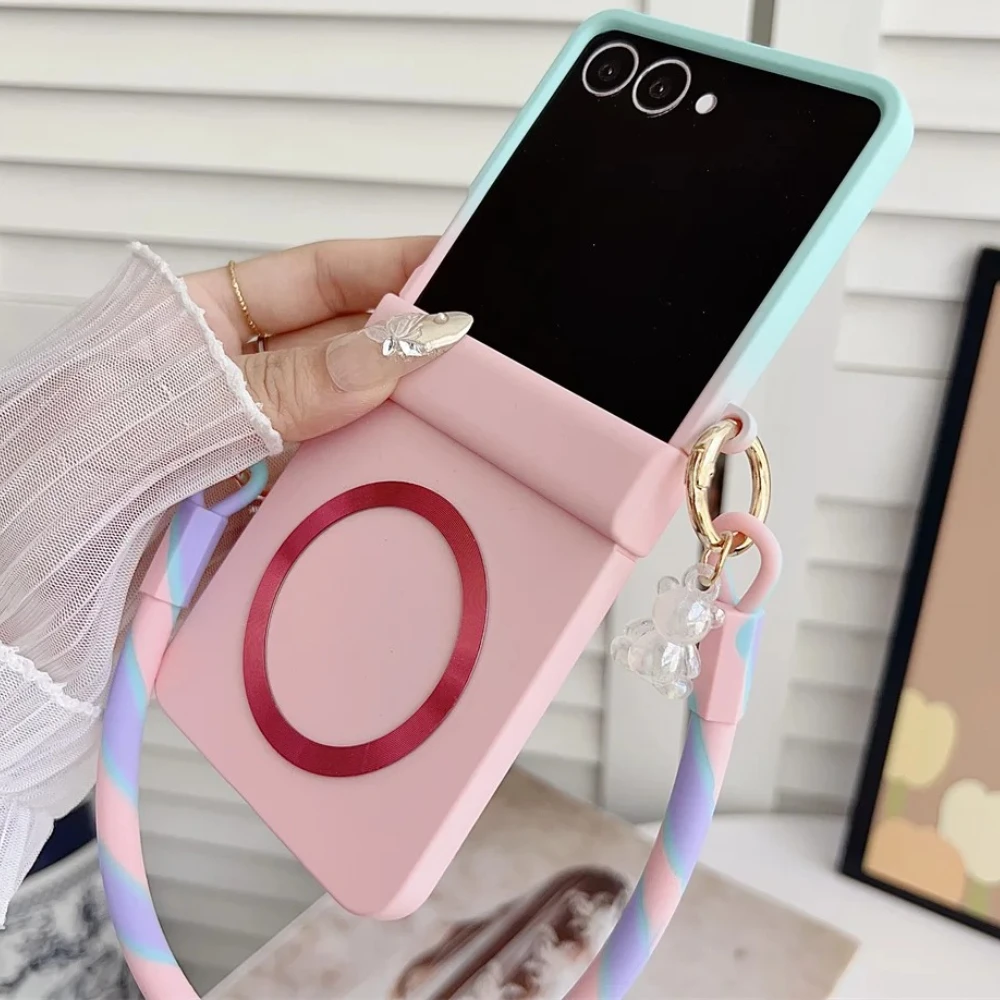 Gradient Candy Color Magnetic Phone Case with Wrist Strap For Samsung Galaxy Z Flip 7 FE 6 5 4 3 Hinge Protection Matte Cover